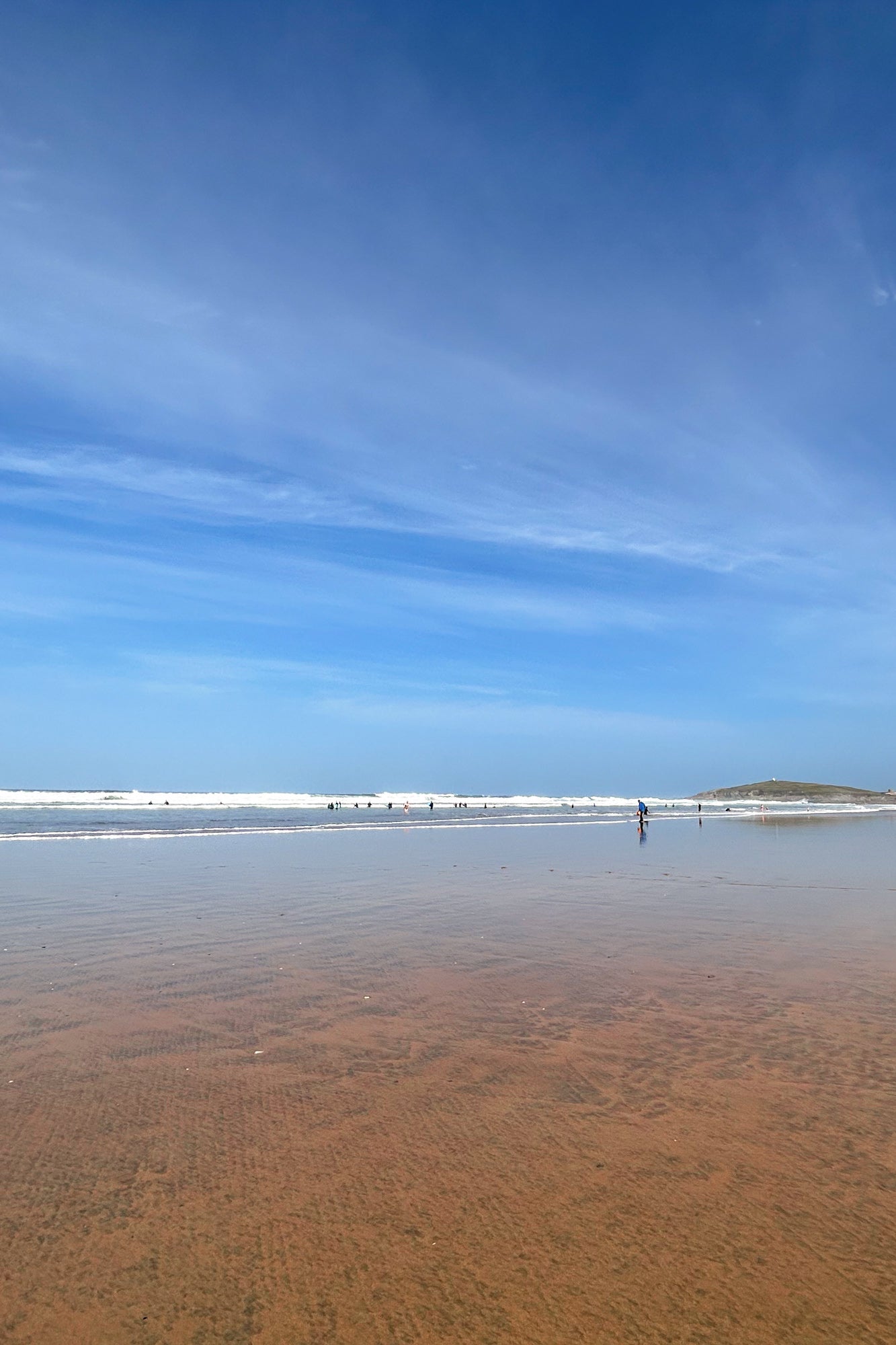 This image captures Fistral beach and sea with a solid bright blue sky with a piece of wet golden sand. It's a simple image but conveys the calmness of walking on a quiet beach on a mid autumn day. You can just see the hut on Towan Headland in the background and a few people at the waters edge and in the water.