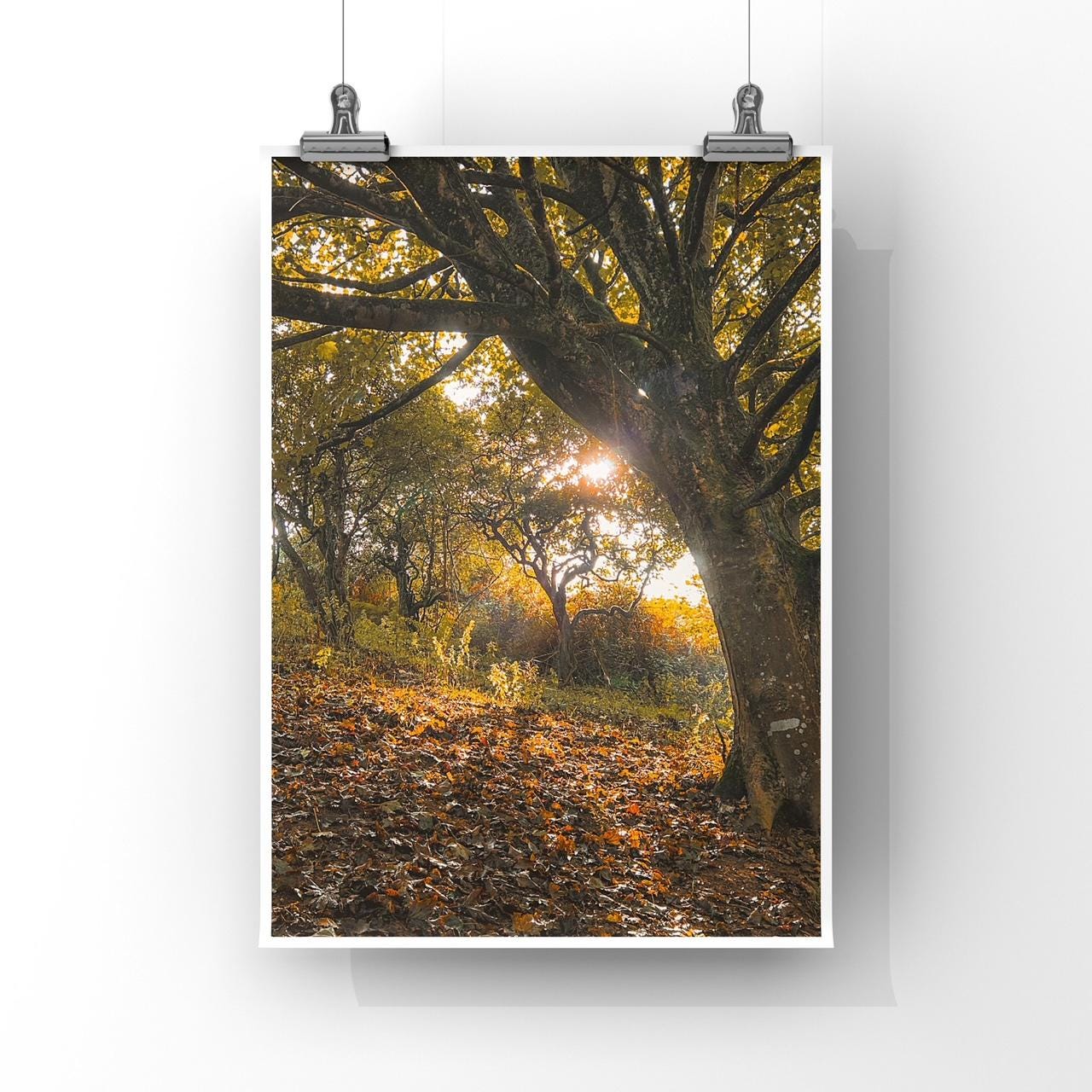 Sun shining through woodland leaves print.