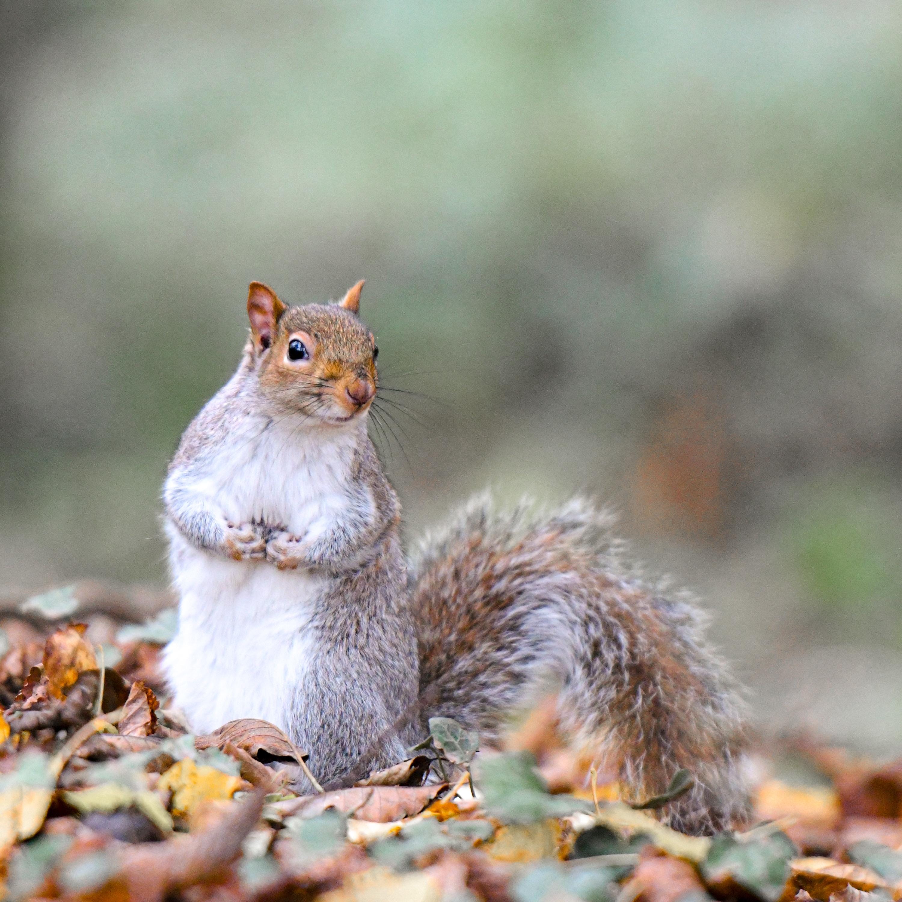 Eastern Grey Squirrel (Sciurus carolinensis) sitting in Autumn fallen leaves on a sunny November afternoon There are a lot of grey squirrels at Tehidy Country Park near Camborne in Cornwall, and I spent a lovely afternoon photographing many of them running around, climbing trees, hiding nuts and playing, at the beginning of November. This one was sat in an endearing position with front paws clasped together, sitting upright amongst the warm Autumn leaves. I love the softness of this green background.