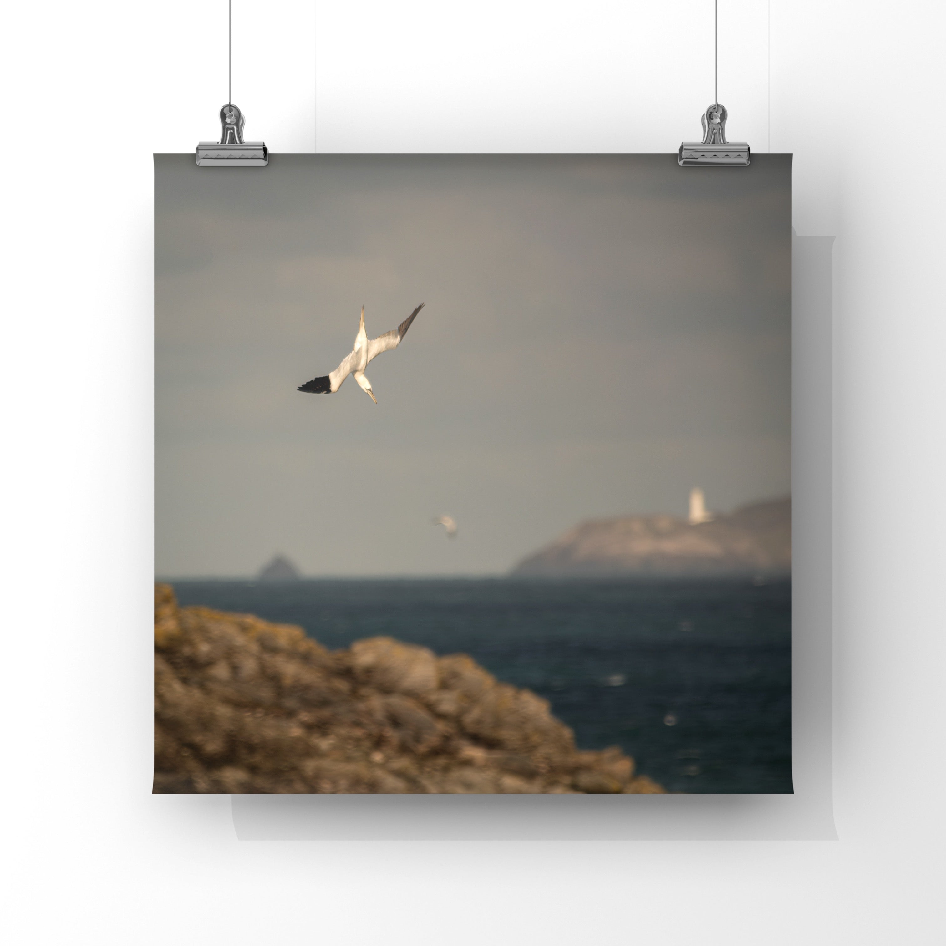 I captured this photograph from the North Cornwall cliffs on a day when there were gannets everywhere. I had never seen so many gannets at once. This individual gannet is mid dive into the sea with Trevose lighthouse and headland in the distance.